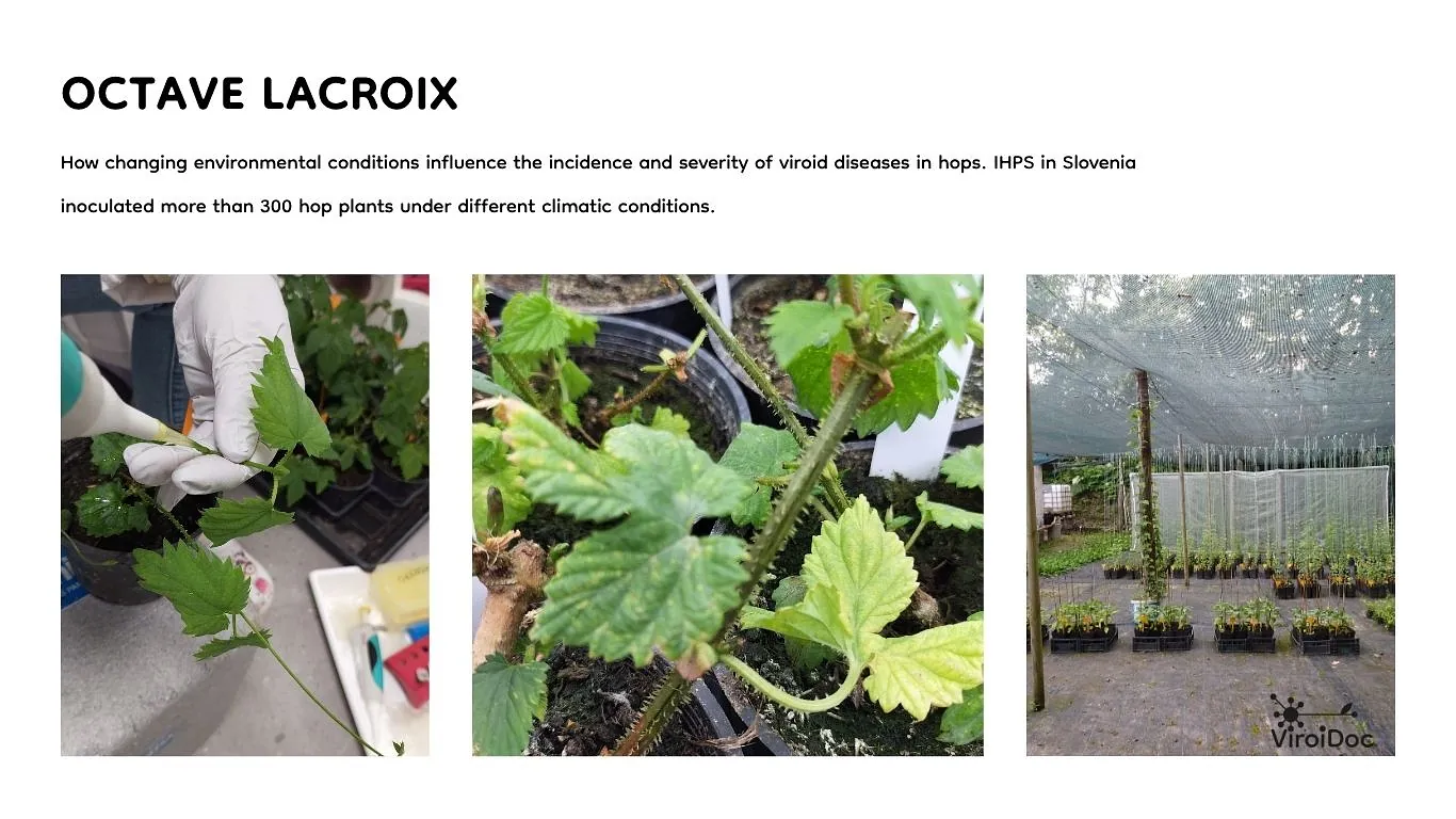 At the IHPS in Slovenia, Octave Lacroix is investigating the impact of climate change on viroid diseases in hops. As part of this work, more than 300 hop plants have been inoculated under controlled climatic conditions to assess viroid transmission dynamics. The study evaluates the success of inoculation with CBCVd (Cocadviroid rimocitri) and HLVd (Cocadviroid latenshumuli) through mechanical wounding under induced drought and heat stress. Physiological and metabolomic parameters were measured at the time of inoculation to better understand plant susceptibility. Preliminary findings indicate increased viroid transmission at elevated temperatures, particularly in the absence of drought stress. Inoculation success will be further assessed using RT-qPCR at 2 and 12 months post-inoculation.