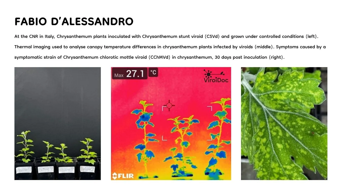 At the CNR in Italy, Fabio D’Alessandro examines the molecular and physiological mechanisms underlying viroid-induced diseases. Using chrysanthemum and tomato as model systems, his research integrates omics approaches with phenotyping to dissect host responses to both symptomatic and latent infections. This work aims to deepen our understanding of viroid–host interactions and support the development of improved disease management strategies and early detection tools.