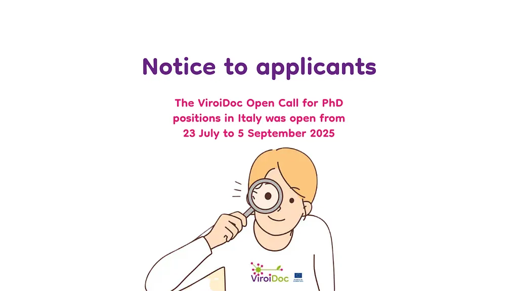 ViroiDoc project partners would like to extend our sincere thanks to all doctoral candidates and early-career researchers who submitted applications for our recent ViroiDoc Open Call for Doctoral Candidates in the fields of plant biology, genetics, cell biology, biology, bioinformatics, biochemistry, chemistry, or a related discipline. The call closed on 5 September 2025.
